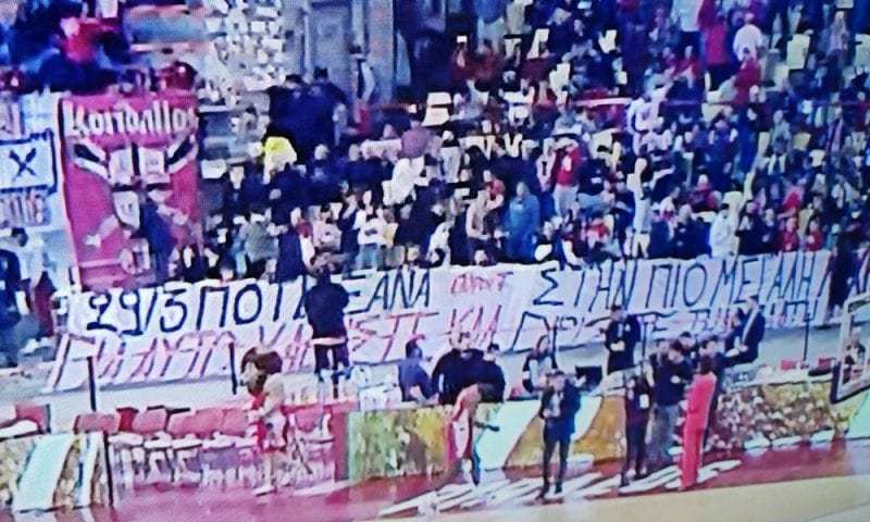 Τα δύο πανό που ανέβηκαν και ήταν ορατά από την τηλεοπτική κάμερα μέχρι και το τέλος της τρίτης περιόδου του αγώνα με τη Βιλερμπάν ανέφεραν: