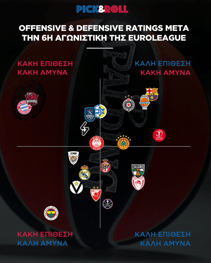 Οι αριθμοί του Offensive Rating (πόντοι ανά 100 κατοχές) και του Defensive Rating (πόντοι που δέχεται ανά 100 κατοχές) αποκαλύπτουν ποιοι έχουν βρει ρυθμό, ποιοι δυσκολεύονται ακόμη και ποιοι προσπαθούν να βρουν ισορροπία ανάμεσα σε επίθεση και άμυνα.