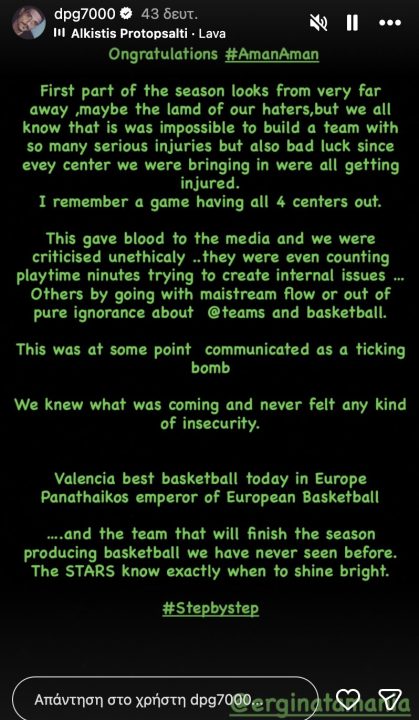 Ο ισχυρός άνδρας της ΚΑΕ Παναθηναϊκός ΑΚΤΟR ανέβασε story στο Instagram με τη φράση «Congratulations #AmanAman», σε σαφή αναφορά προς τον 60χρονο προπονητή, πριν περάσει σε ένα πιο αναλυτικό μήνυμα για τη φετινή πορεία της ομάδας.