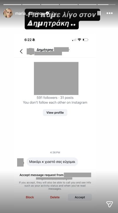 Η Μαρία Δαρσινού δημοσίευσε σε story το μήνυμα που της εστάλη, θέλοντας προφανώς να αναδείξει το μέγεθος της τοξικότητας που ακολούθησε τον τραυματισμό του διεθνούς γκαρντ. «Μακάρι και χιαστό σας εύχομαι», έγραφε το μήνυμα που εμφανίστηκε στα inbox του λογαριασμού της, προκαλώντας σοκ και οργή.