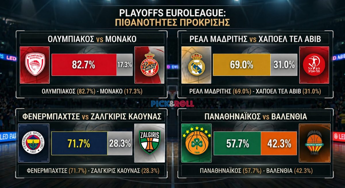 Η εικόνα των αποδόσεων για τα τέσσερα ζευγάρια των πλέι-οφ της EuroLeague δείχνει ξεκάθαρα φαβορί, αλλά όχι παντού στον ίδιο βαθμό. Το pickandroll.gr μετέτρεψε τις αποδόσεις σε πιθανότητες και προκύπτει ότι ο Ολυμπιακός έχει το μεγαλύτερο προβάδισμα από όλους για το Final Four, ενώ το πιο ανοιχτό ζευγάρι είναι αυτό της Βαλένθια με τον Παναθηναϊκό.